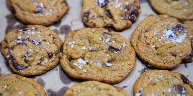 Using #40 cookie scoop, place 12 cookies on a half sheet pan (no need to flatten). Bake in a preheated 350 degree oven for 15 minutes. Sprinkle Maldon sea salt flakes over each cookie. Cool on open brown paper bag. Store in air tight container.