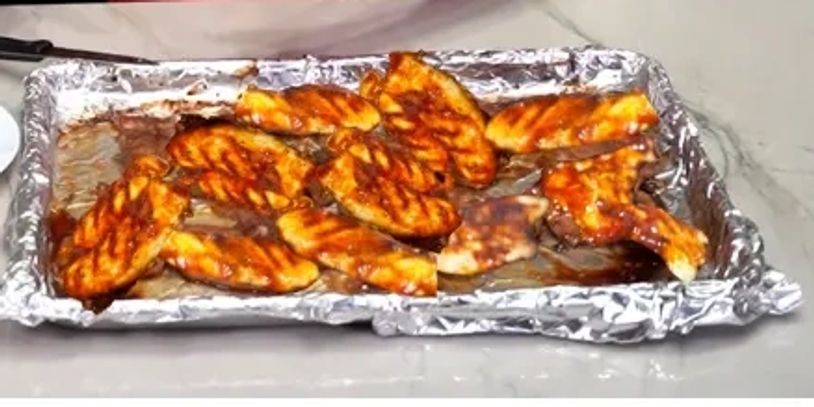Mix everything together. Marinate 1 hour or up to 24 hours. Line 1/2 sheet pan with foil. Arrange pieces on foil not touching each other. Bake in preheated 375 degree oven 45-60 minutes till tender.