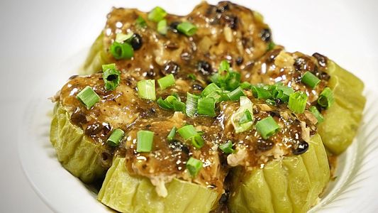 Bitter melon is slightly bitter but loved by most Chinese. We were brought up eating the stuffed melon and were encouraged to at least take one bite to get used to the taste. I was the same but now I love the flavor and cook it in several different ways. It is a tropical vine that is related to the zucchini, squash, pumpkin and cucumber. It is high in vitamin C and A and has antioxidant properties . It is low in calories and high in protein. The pork hash in this dish balances the bitter taste and makes it more enjoyable to eat.