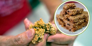 Delicious and nutritious snack made with simple ingredients. A treat for all ages, especially children. Good for school lunches, picnics, parties, hiking and just plain snacking. Sticky while making but hardens up in the refrigerator. Eat one and you'll want more, so satisfying.