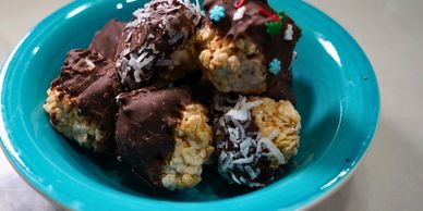 In a large pot, melt butter on low heat. Add marshmallows and stir till completely melted. Stir till well mixed. Add vanilla and mix. Pour in cereal and fold till well combined. Transfer to a tray and let cool 5-10 minutes. Put on disposable gloves and spray with non stick spray to prevent sticking. Form into golf ball size balls. Stick a toothpick in each ball for easy handling. Put 1 c chocolate chips in a microwave safe bowl and heat for 30 seconds, stir and heat for 15 second increments until melted. Remove and add 1 T oil. Stir well. Line a tray with wax paper.
