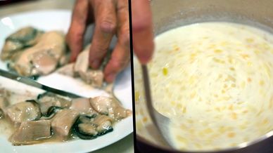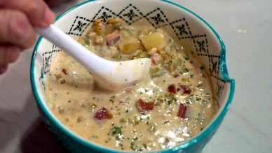 Clam chowder is a rich, creamy soup made with clams, potatoes, onions, and often celery, simmered in a milk or a cream base. It has clams (fresh, canned, or bottled) and their juices are added for extra flavor. Bacon is often cooked first to give the broth a smoky depth, and fresh herbs like thyme or parsley are added near the end.